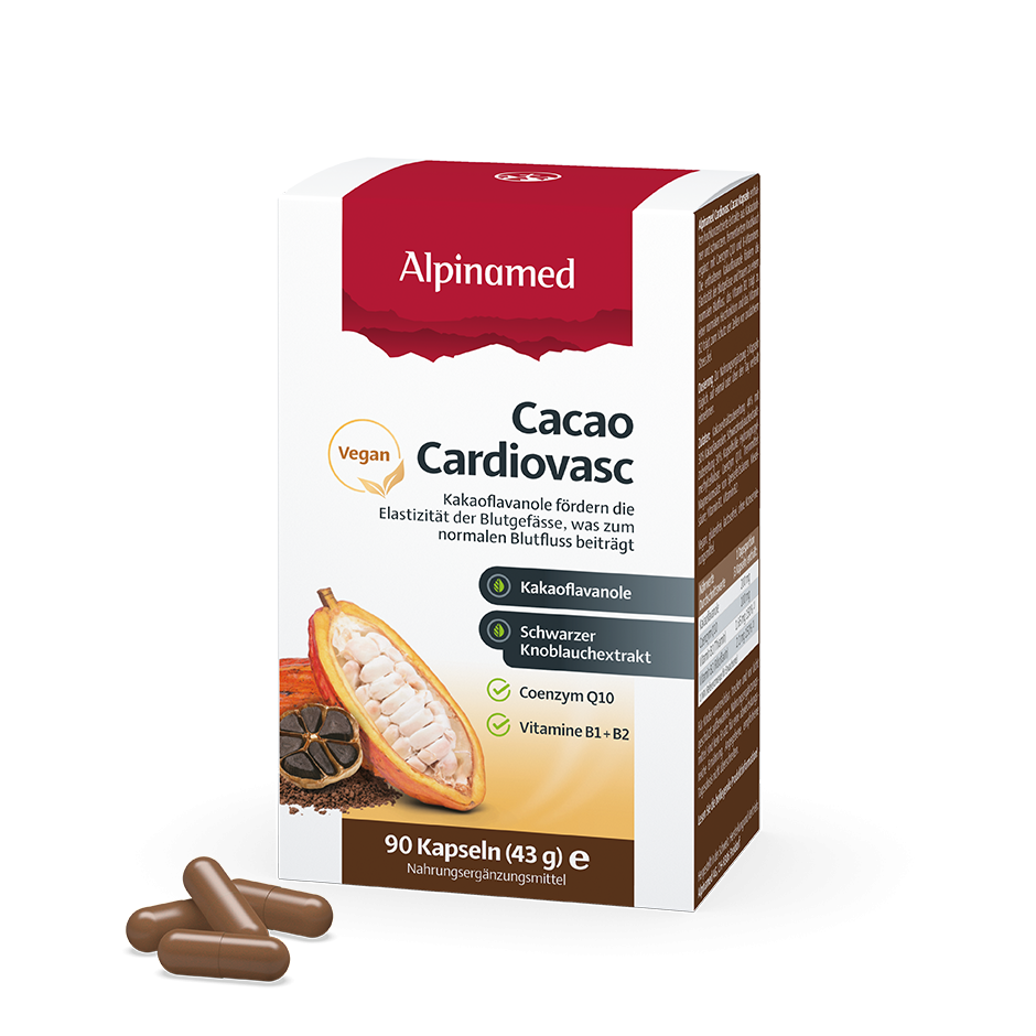 ALPINAMED Cardiovasc Cacao Kapseln sind ein sorgfältig hergestelltes Nahrungsergänzungsmittel aus der Schweiz. Sie kombinieren hochwertige Inhaltsstoffe wie Kakaoflavanole, fermentierten schwarzen Knoblauch, Coenzym Q10 sowie die Vitamine B1 und B2. Diese Zusammensetzung wurde entwickelt, um gezielt Funktionen des Herz-Kreislauf-Systems und des Nervensystems zu unterstützen.