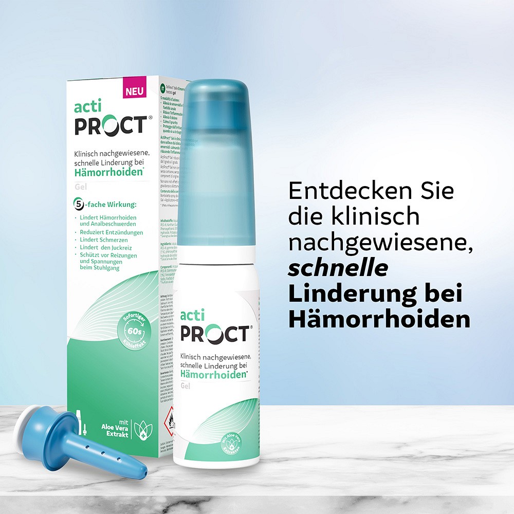 ActiProct® Gel mit Applikator ist eine klinisch geprüfte, sofort lindernde Behandlung bei Hämorrhoiden und analen Beschwerden. Die innovative Gel-Formel mit Aloe Vera wirkt kühlend, beruhigend und schützt die empfindliche Haut – ideal zur Behandlung und Vorbeugung.
