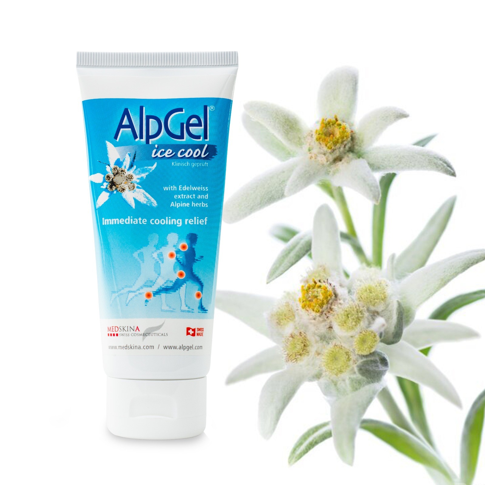 AlpGel® Ice-Cool ist das erfrischende Bein-Gel mit 100 % Pflanzenformel und standardisiertem Edelweiss-Extrakt. Es kühlt sofort, belebt spürbar und unterstützt die Regeneration nach langem Sitzen, Stehen oder an warmen Tagen. Die leichte Gel-Textur zieht schnell ein, fettet nicht und hinterlässt ein angenehm frisches Hautgefühl. In klinischen Studien zeigte sich eine sehr gute Hautverträglichkeit.