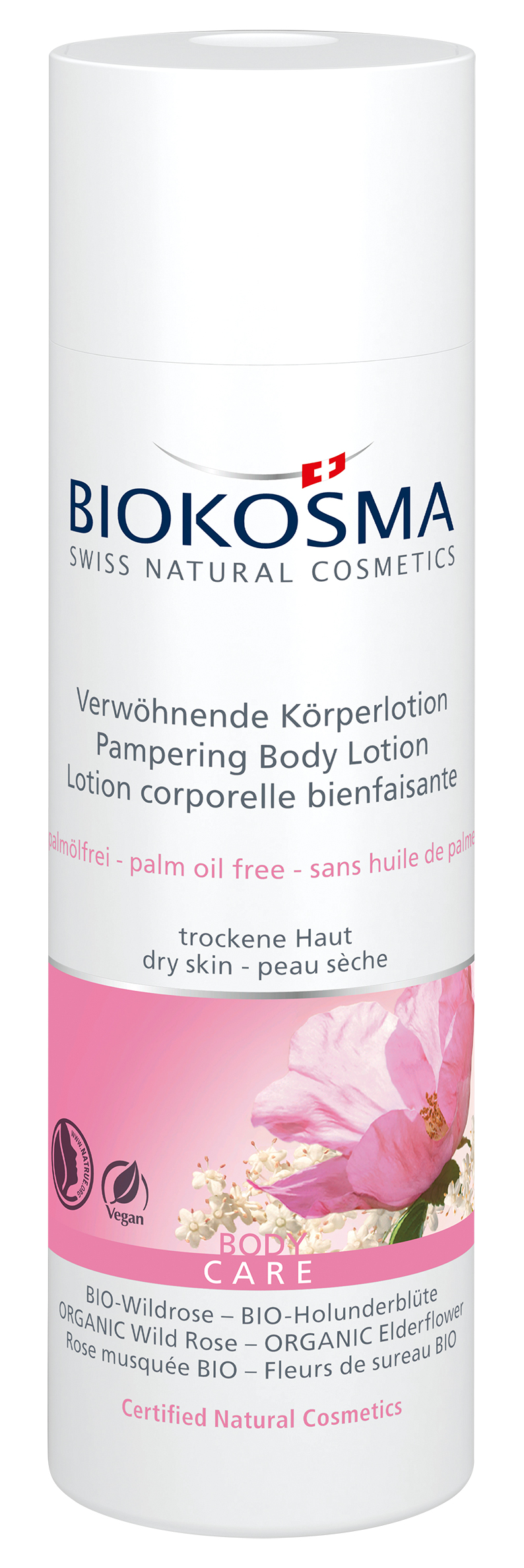 Verwöhnende Körperlotion mit BIO-Wildrosenextrakt und BIO-Holunderblütenextrakt aus der Schweiz für trockene Haut.