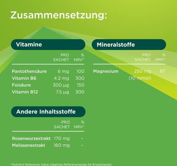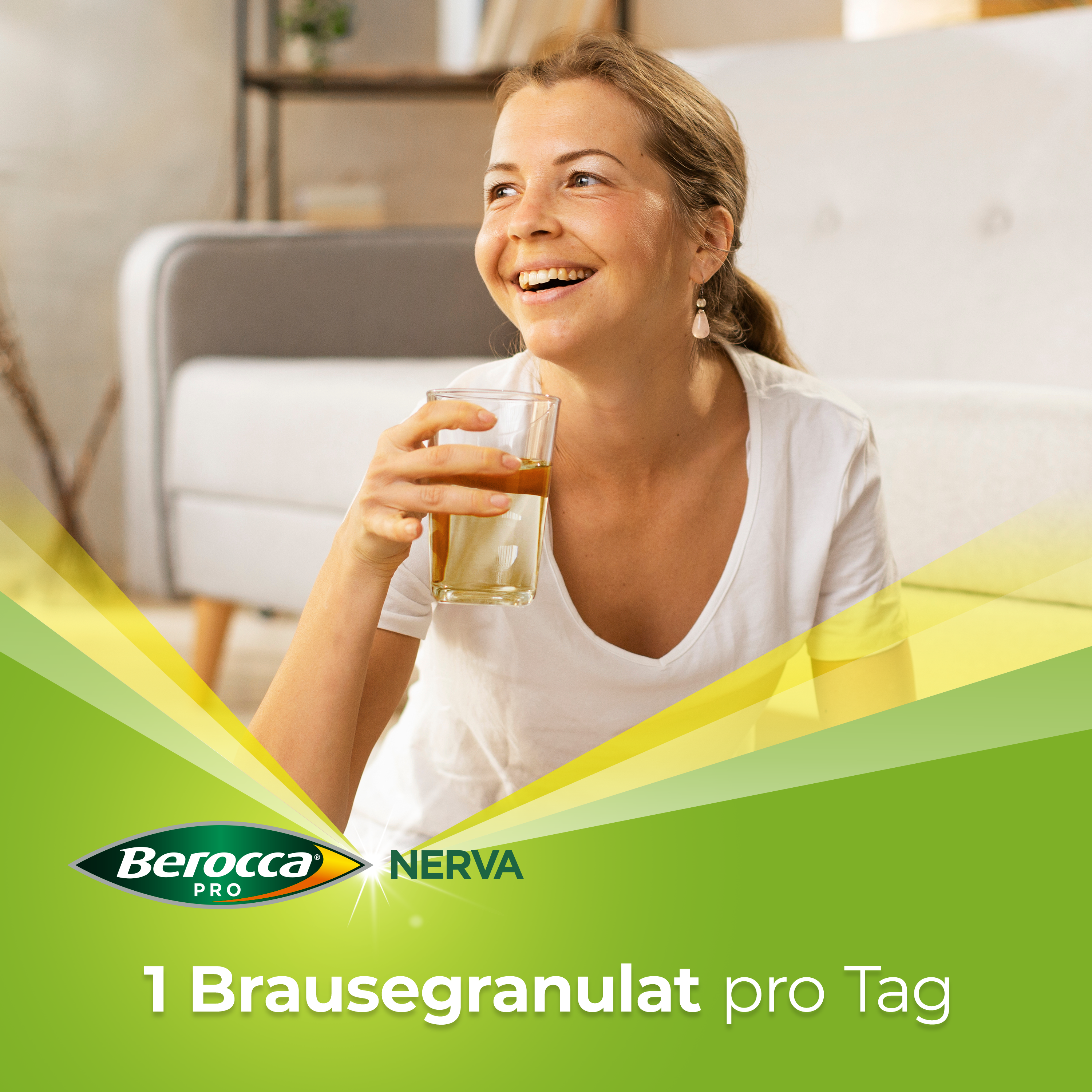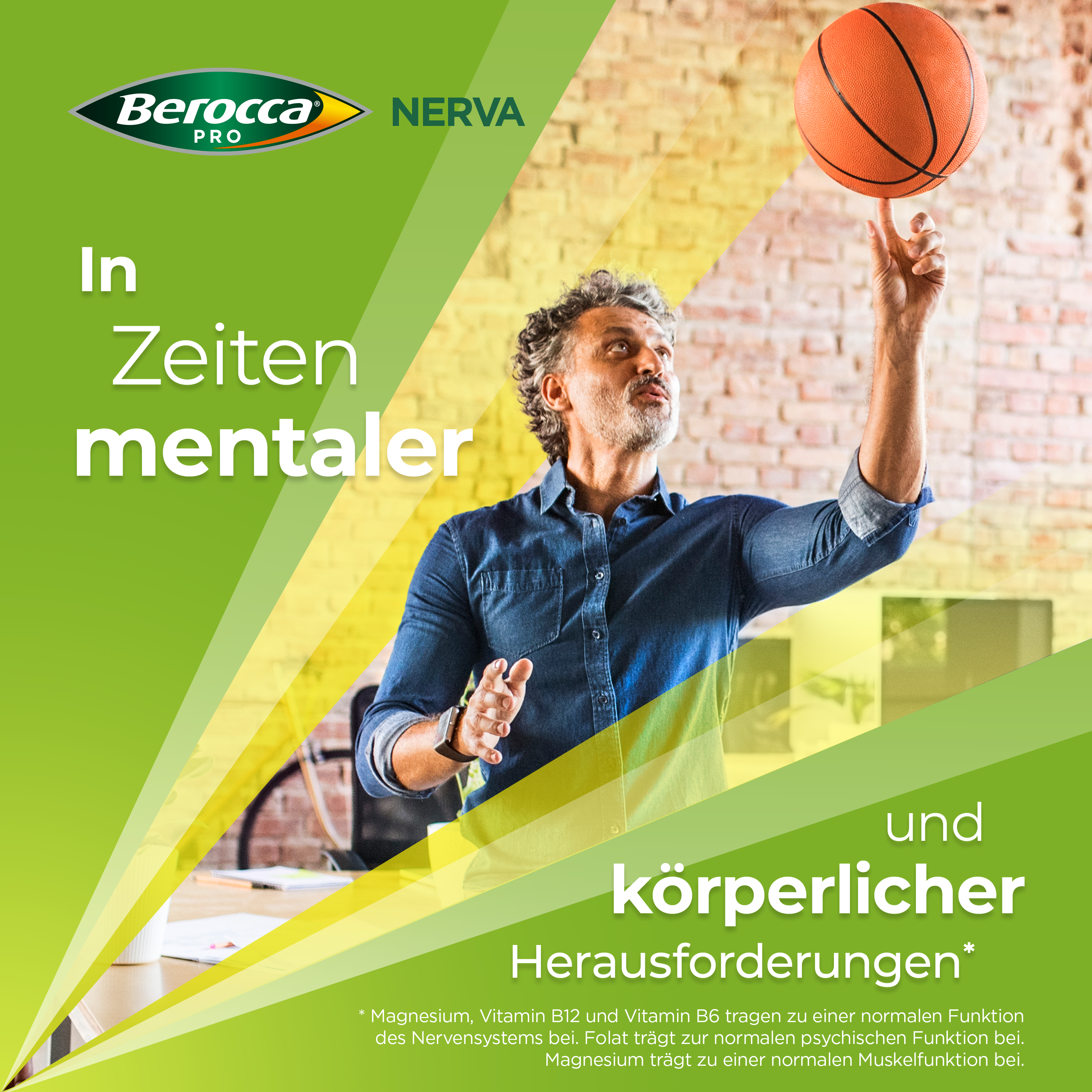 Jeder Tag bringt neue Herausforderungen. Berocca® Pro Nerva wurde speziell entwickelt, um Ihre Nerven und Muskeln in Zeiten mentaler und körperlicher Belastung zu unterstützen. Mit einer einzigartigen Kombination aus **Magnesium, Rosenwurz- und Melissenextrakt sowie ausgewählten B-Vitaminen** trägt dieses Brausegranulat zur normalen Funktion von Nerven und Muskeln bei.