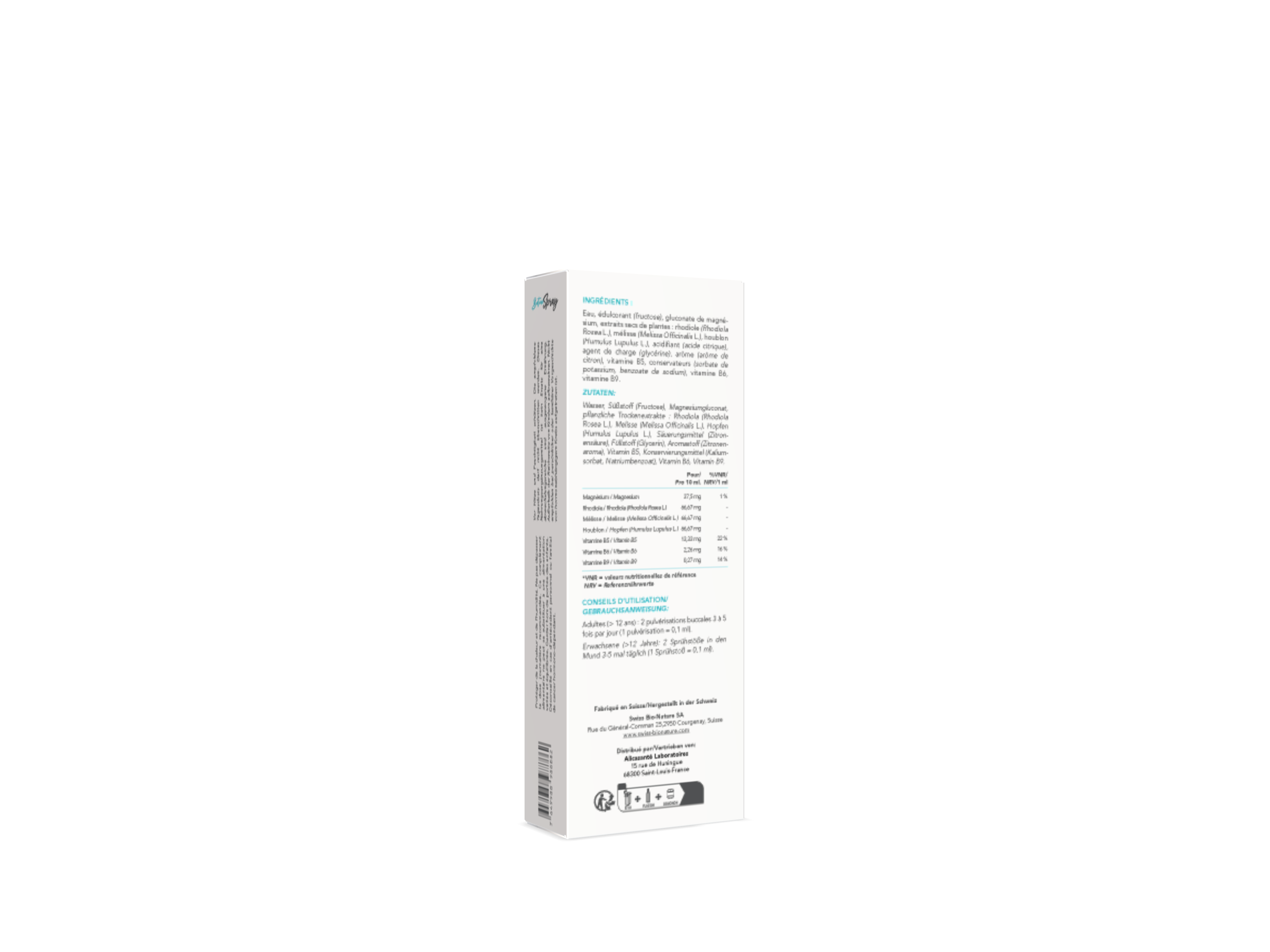Gereinigtes Wasser, Fruktose, Magnesium, Rhodiola-Extrakt, Melissen-Extrakt, Hopfen-Extrakt, Vitamin B5, Vitamin B6, Vitamin B9, Zitronenaroma und Konservierungsstoffe.