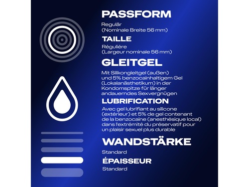 Durex Performa Kondome sind speziell entwickelt, um das intime Erlebnis zu verlängern. Die Innenseite ist mit einem benzocainhaltigen Gleitmittel beschichtet, das dem Mann hilft, den Höhepunkt hinauszuzögern und die Erregungsphase zu verlängern. So entsteht ein intensiveres und länger andauerndes Liebeserlebnis.
