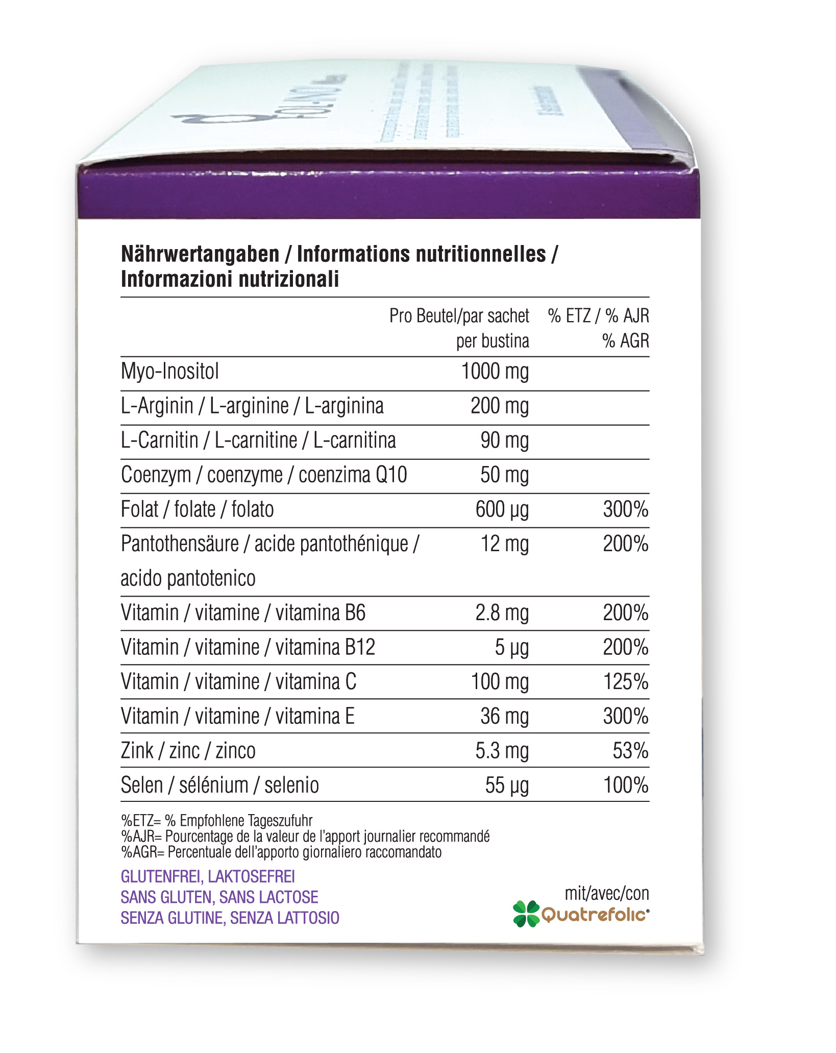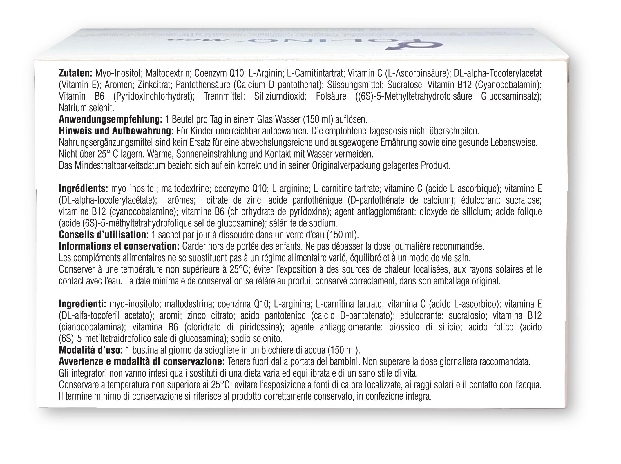 Nahrungsergänzungsmittel mit Myo-Inositol, L-Arginin, L-Carnitin, Coenzym Q10, Folat, Vitaminen, Mineralstoffe.