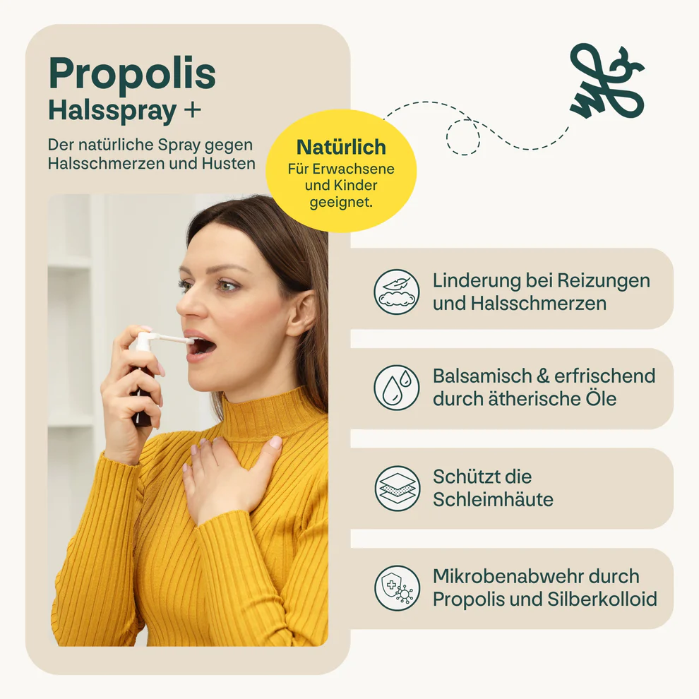 - Propolis (12% Galangin): Das natürliche Schutzschild der Bienen wirkt regenerierend und schützend im Rachenraum.