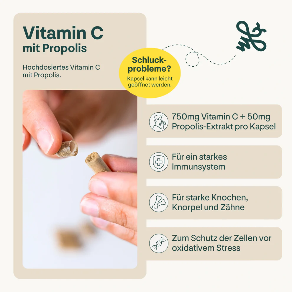 Ergänzt wird das Vitamin C durch 50 mg Bio-Propolis-Trockenextrakt (standardisiert auf 6 % Polyphenole). Propolis wird von Bienen als natürliches Schutzschild genutzt und ist reich an bioaktiven Pflanzenstoffen. In Kombination mit Vitamin C entsteht eine starke Synergie, die Ihren Körper dabei unterstützt, oxidativen Stress abzuwehren und vital zu bleiben.