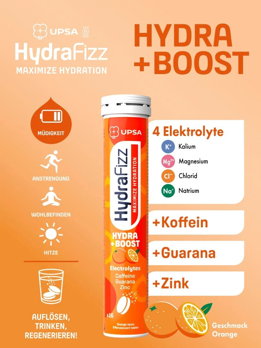 HYDRAFIZZ Hydra + Boost ist ein innovatives Nahrungsergänzungsmittel in Form von Brausetabletten, das speziell für eine optimale Hydration, verbesserte Konzentration und nachhaltige Regeneration entwickelt wurde. Die einzigartige Kombination aus Elektrolyten, Vitaminen, Mineralstoffen und Pflanzenextrakten unterstützt den Körper in Phasen erhöhter Belastung und trägt zum allgemeinen Wohlbefinden bei.