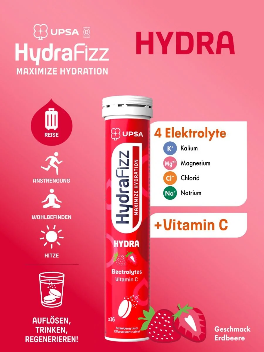 Die isotonische Formel der HYDRAFIZZ Hydra Brausetabletten verbessert durch Elektrolyte und Kohlenhydrate nachweislich die Wasseraufnahme im Körper – ein entscheidender Vorteil bei Hitze, körperlicher Belastung, Reisen oder stressigen Tagen.