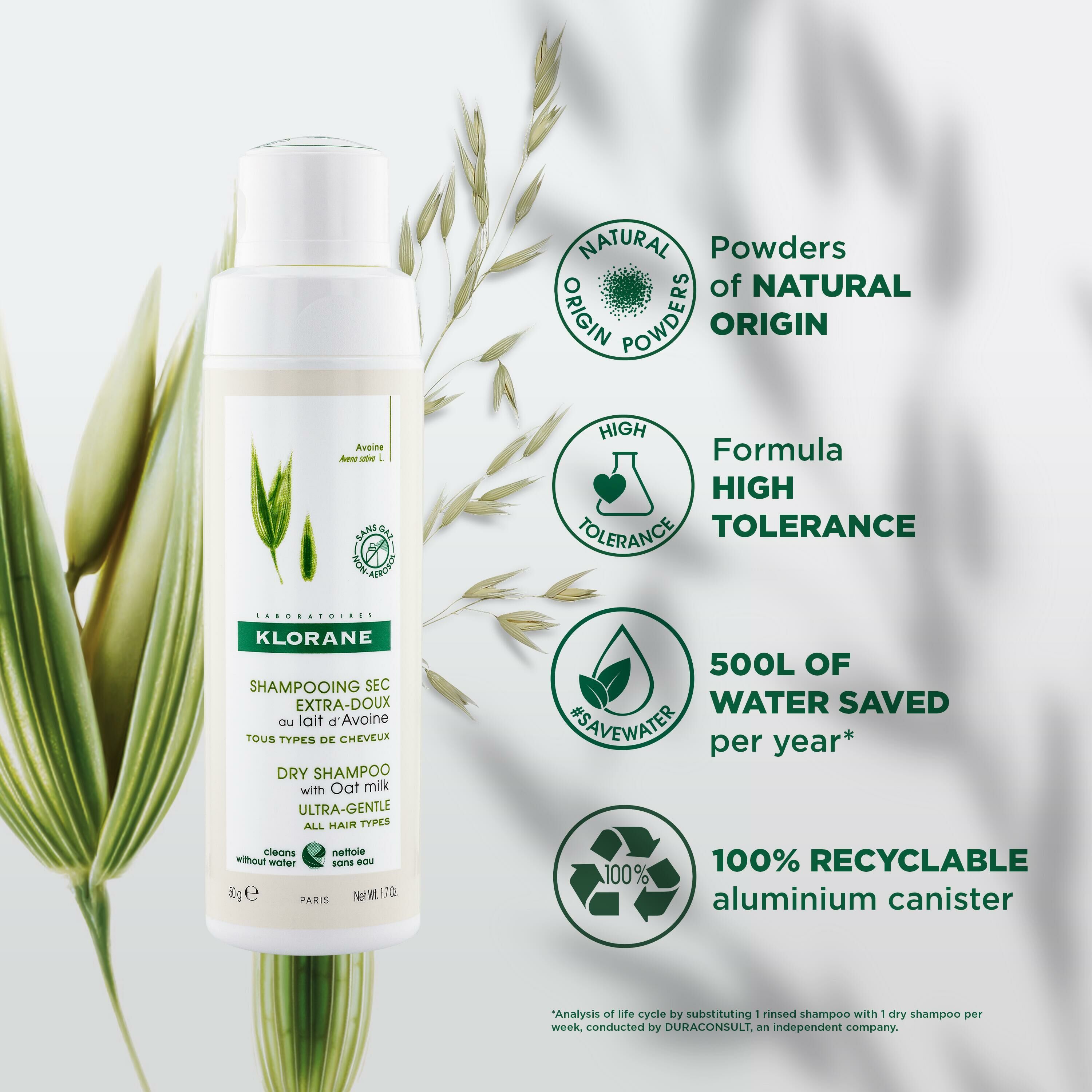 Seit 1971 sorgt das Klorane Trockenshampoo mit Hafermilch für Frische und Leichtigkeit zwischen den Waschgängen und spart dabei Wasser.