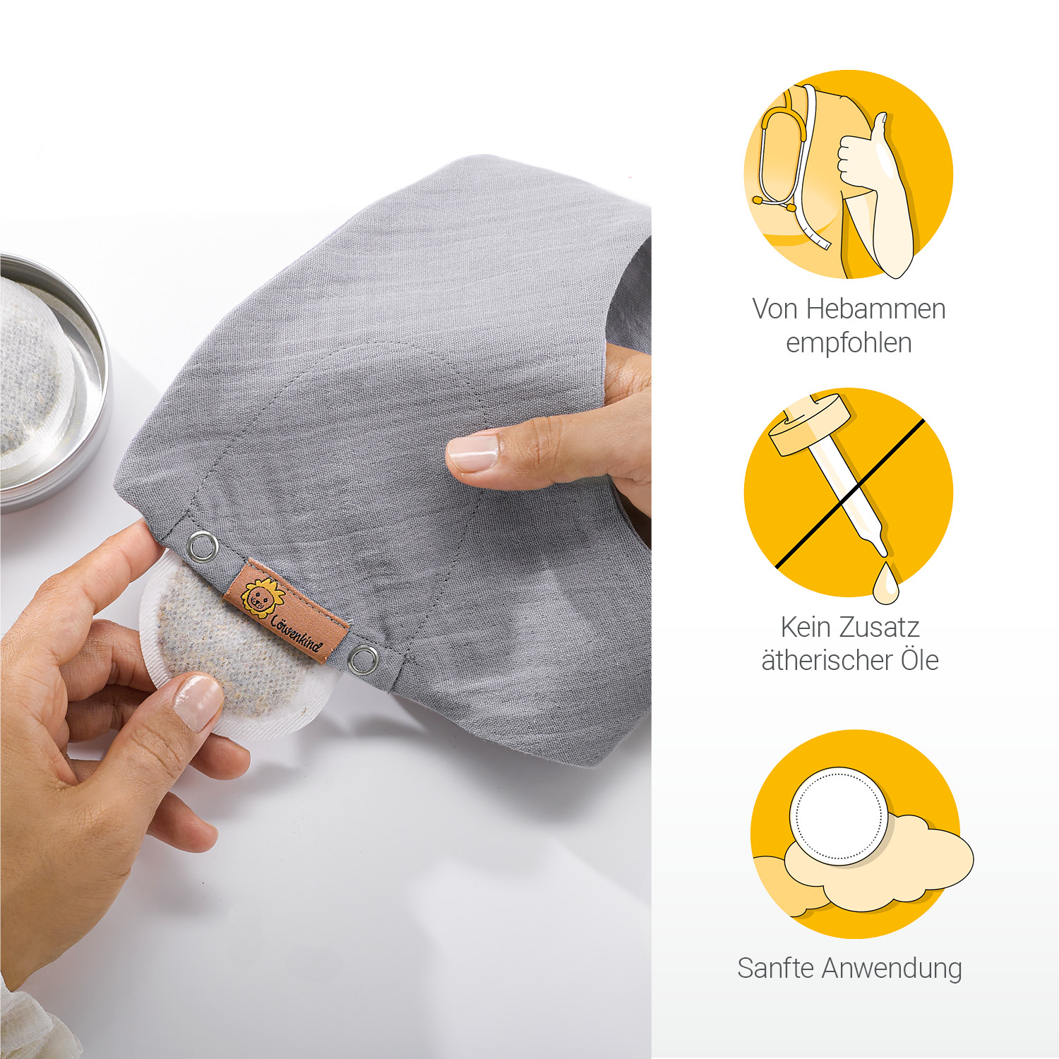 Die Löwenkind-Pads werden in die integrierte Padtasche des Halstuchs eingesetzt. Durch die Körperwärme des Kindes entfalten die Kräuter ihre natürliche Wirkung, und der angenehme Duft wird über die Atemwege aufgenommen. Dies trägt zu einem wohltuenden Gefühl bei und unterstützt das Wohlbefinden deines Kindes – ob tagsüber oder während der Nacht.