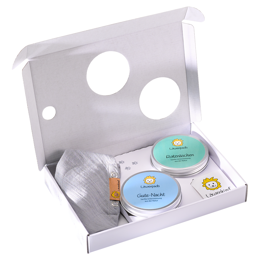 Die Löwenkind Einsteigerbox Mini Grau ist die ideale Wahl für Eltern, die die Vorteile der Löwenkind-Pads kennenlernen möchten. Diese praktische Box enthält je eine Dose der Rotznäschen-Pads und der Gute-Nacht-Pads, kombiniert mit einem hochwertigen Musselin-Halstuch in Grau, das speziell für die Anwendung der Pads entwickelt wurde.