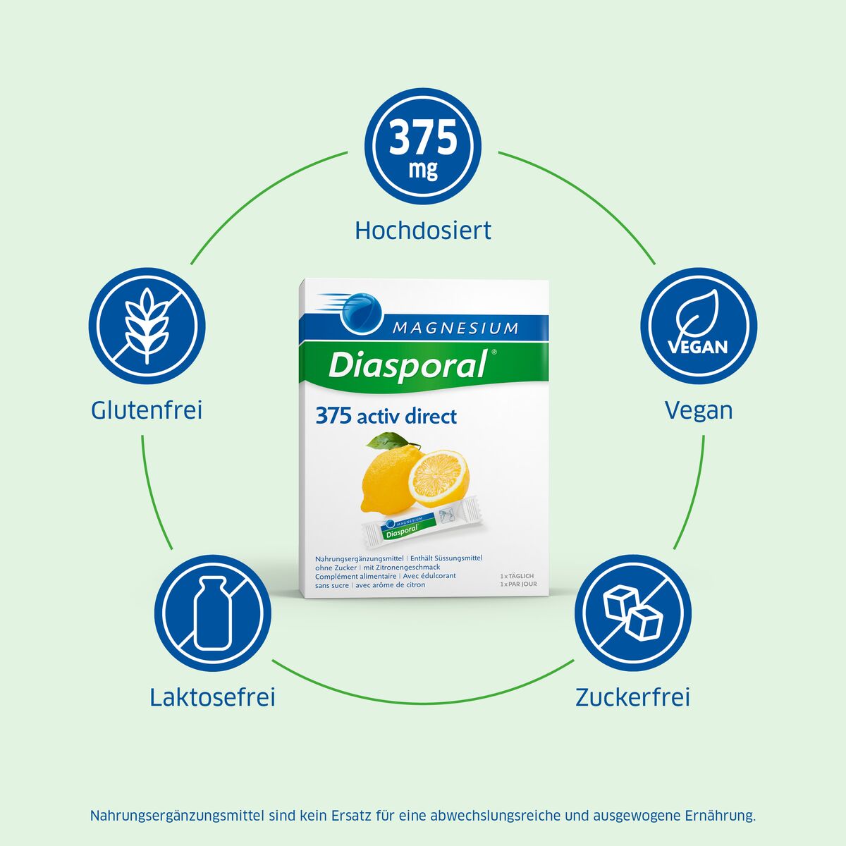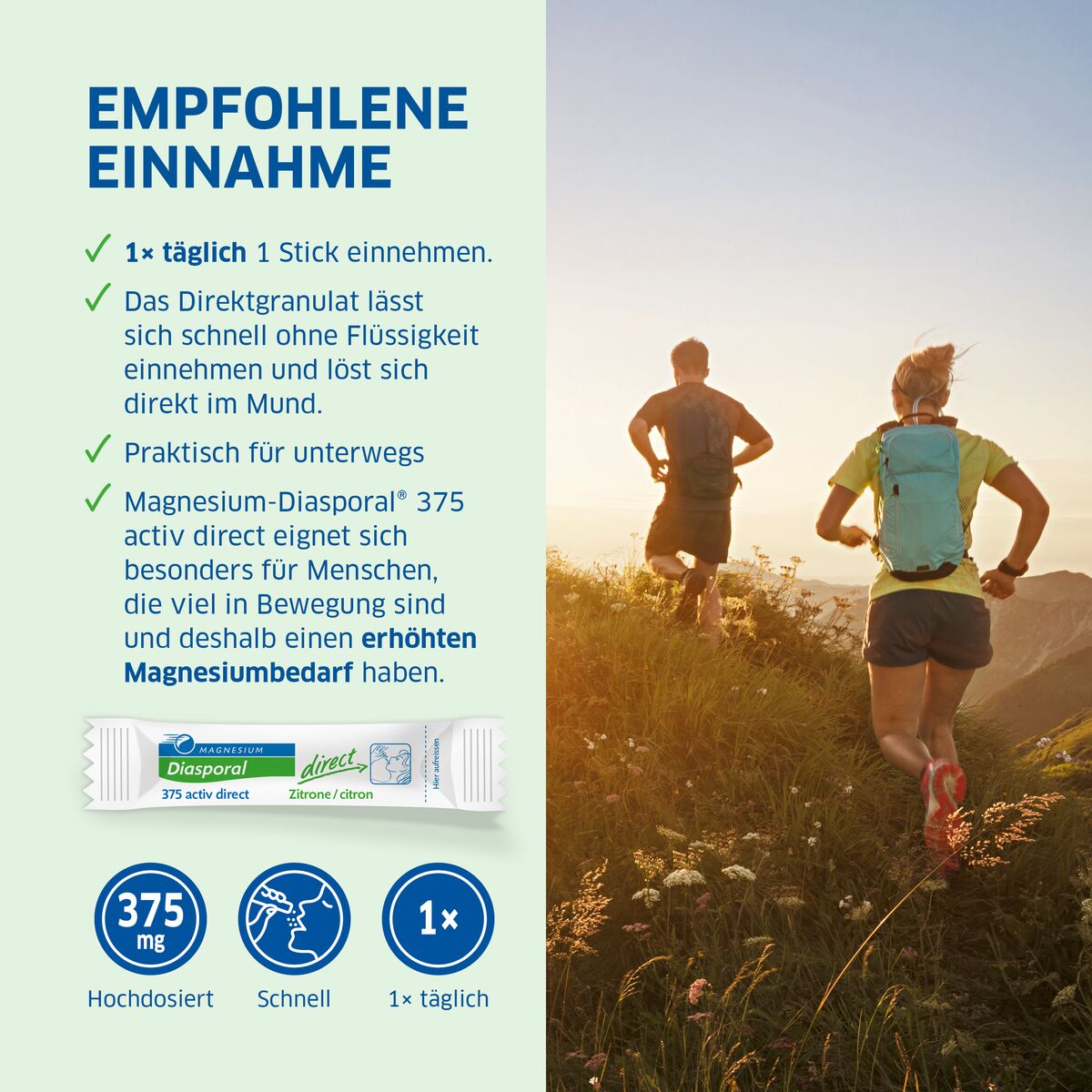 Bereits 1 Magnesium-Diasporal® 375 activ Direct Stick täglich versorgt Ihren Körper mit 375 mg Magnesium und trägt zur Deckung eines erhöhten Bedarfs bei.