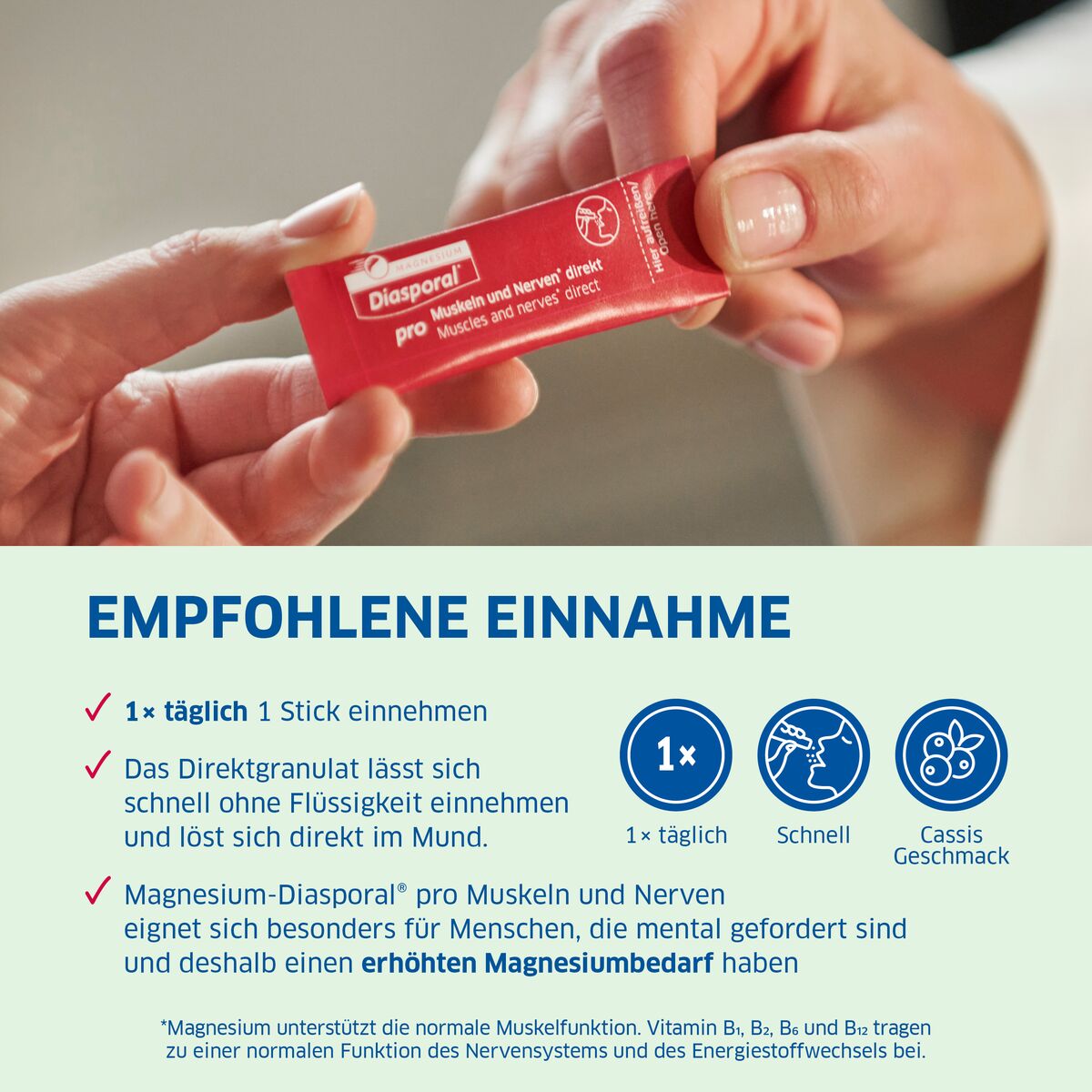 Nehmen Sie täglich den Inhalt eines Sticks direkt auf die Zunge. Das Granulat löst sich in Sekundenschnelle auf und kann ohne Flüssigkeit geschluckt werden. Die einfache Einnahme macht Magnesium Diasporal® Pro M+N Direct zur perfekten Wahl für unterwegs.