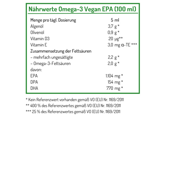 EPA- und DHA-reiches Öl aus der Mikroalge Schizochytrium sp. (80 %), Olivenöl (19 %), Sonnenblumenöl (0,5 %), Orangenöl, Antioxidationsmittel (Tocopherole), Cholecalciferol (Vitamin D3, vegan).