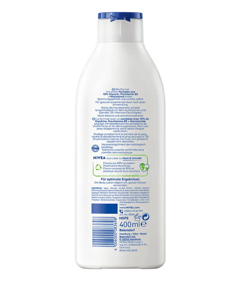 Die NIVEA Repair & Care Body Lotion wurde speziell für trockene bis sehr trockene Haut entwickelt. Ihre einzigartige Formel mit einem 10 % Komplex aus Glycerin, Provitamin B5 und Niacinamid spendet 72 Stunden Feuchtigkeit, stärkt die Hautbarriere und sorgt für ein gesundes Hautbild. Die leichte, nicht fettende Textur zieht schnell ein und hinterlässt ein angenehmes Hautgefühl.