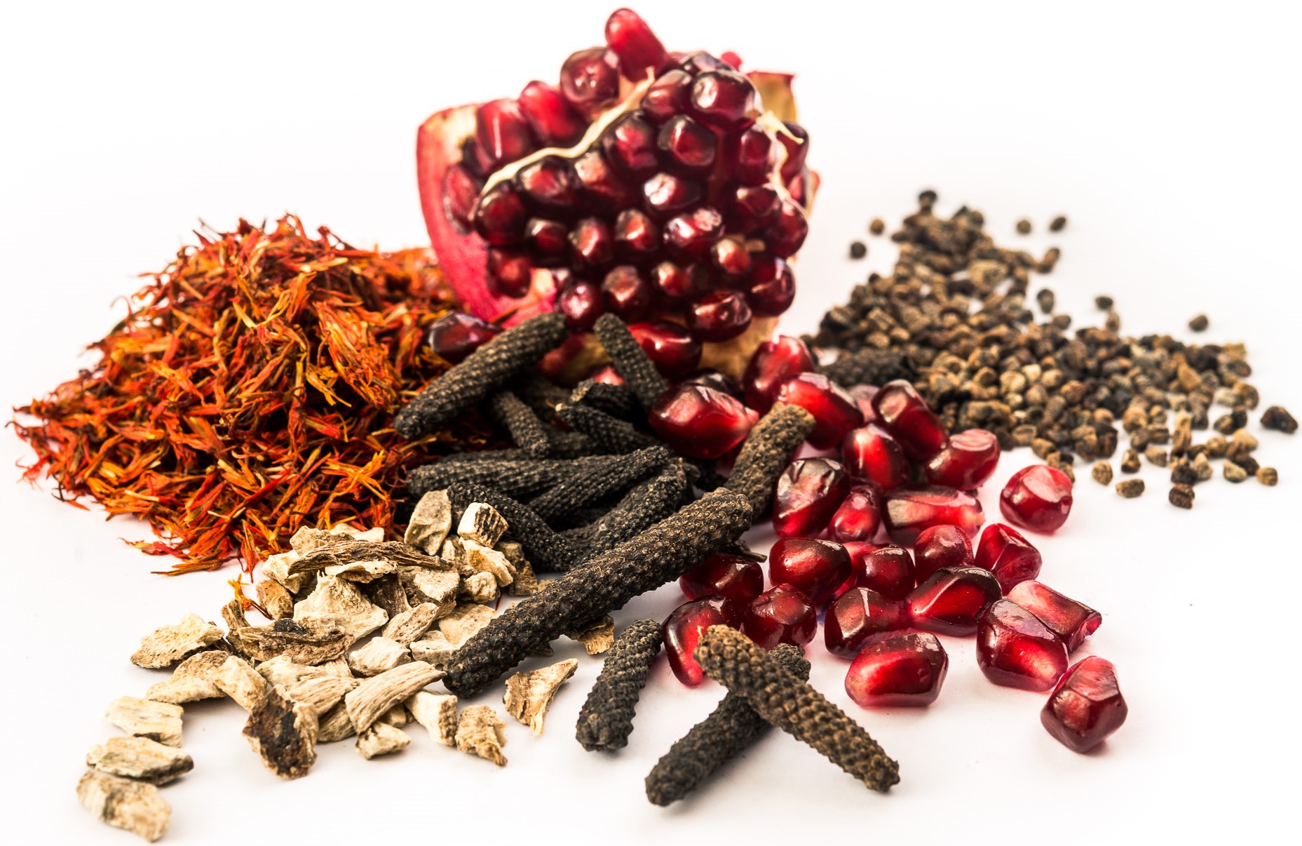Ergänzt mit Granatapfel und den naturbelassenen Gewürzen Alantwurzel, Kardamom, Färberdistelblüten und Langem Pfeffer.