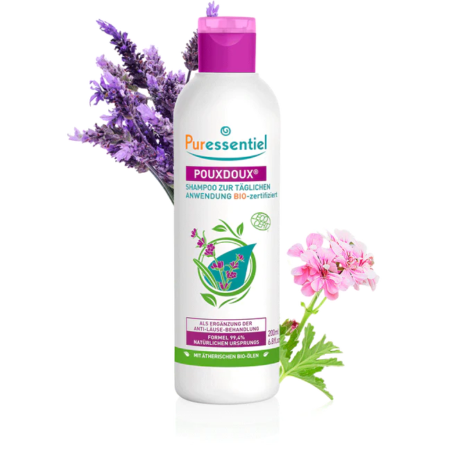 Das Shampoo Pouxdoux® mit reinen und natürlichen ätherischen Lavendel-, Lavandin-, Ylang-Ylang- und Geranium-Bio-Ölen wird zur Behandlung der Kopfhaut verwendet und hilft, Nissen und abgestorbene Läuse zu entfernen.