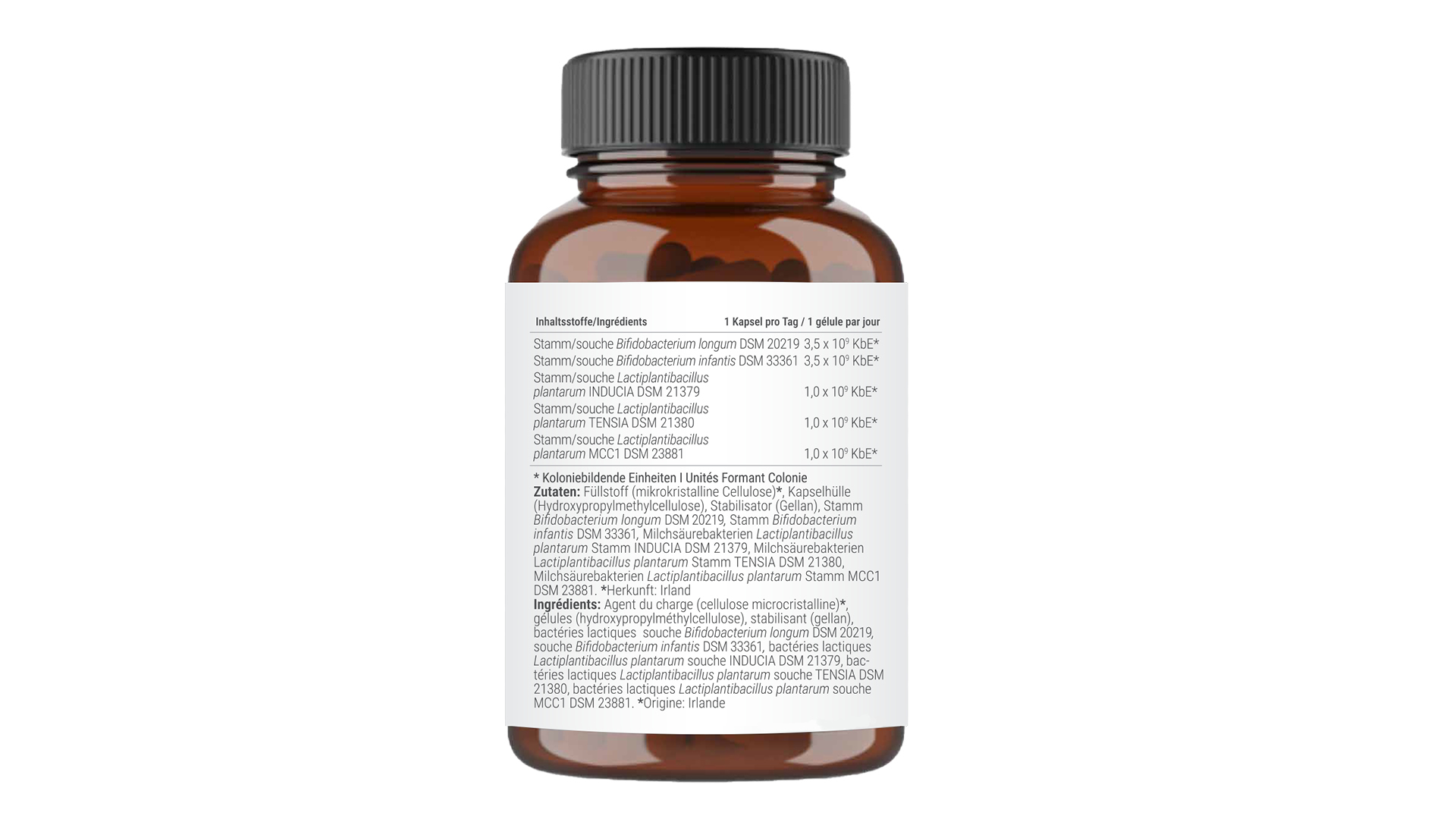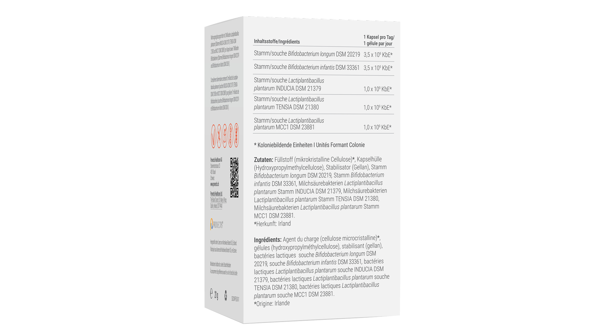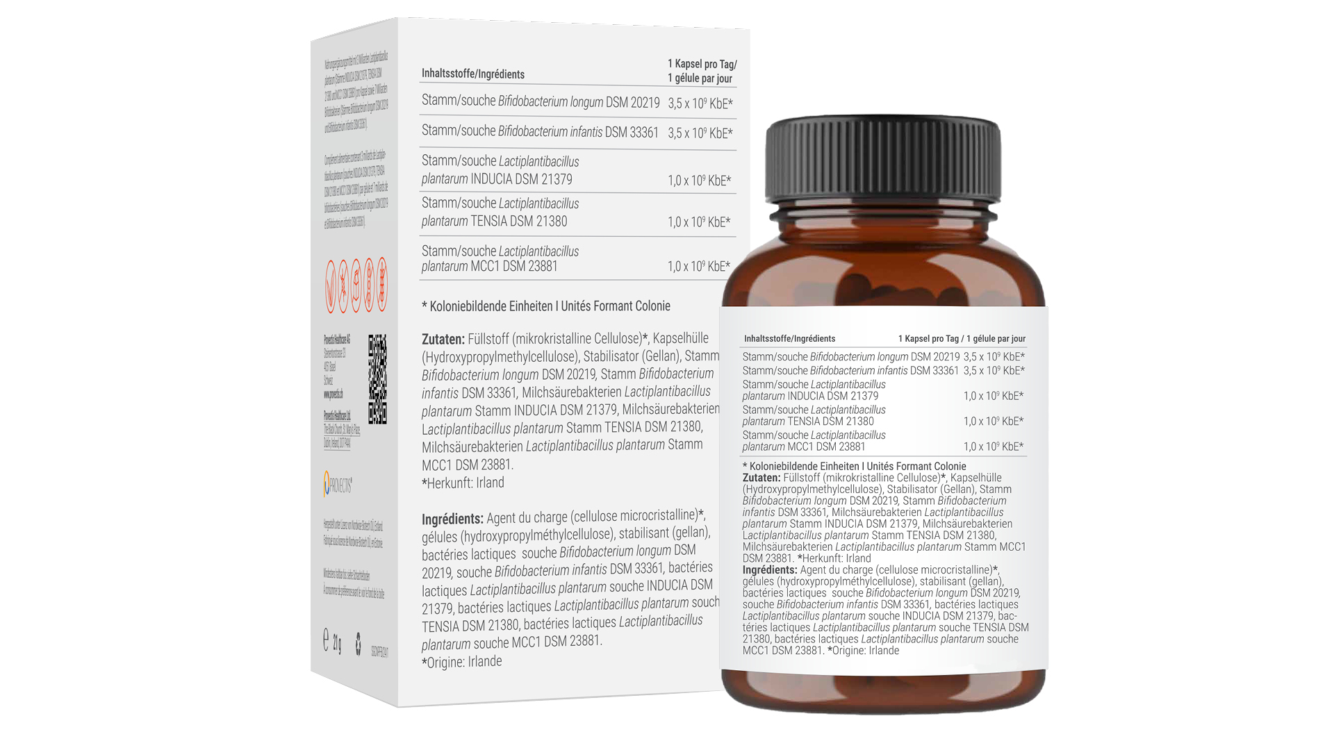 Füllstoff (mikrokristalline Cellulose, Herkunft: Irland), Kapseln (Hydroxypropylmethylcellulose), Milchsäurebakterien (Bifidobacterium longum, Bifidobacterium infantis, Lactiplantibacillus plantarum MCC1, Lactiplantibacillus plantarum INDUCIA®, Lactiplantibacillus plantarum TENSIA®).