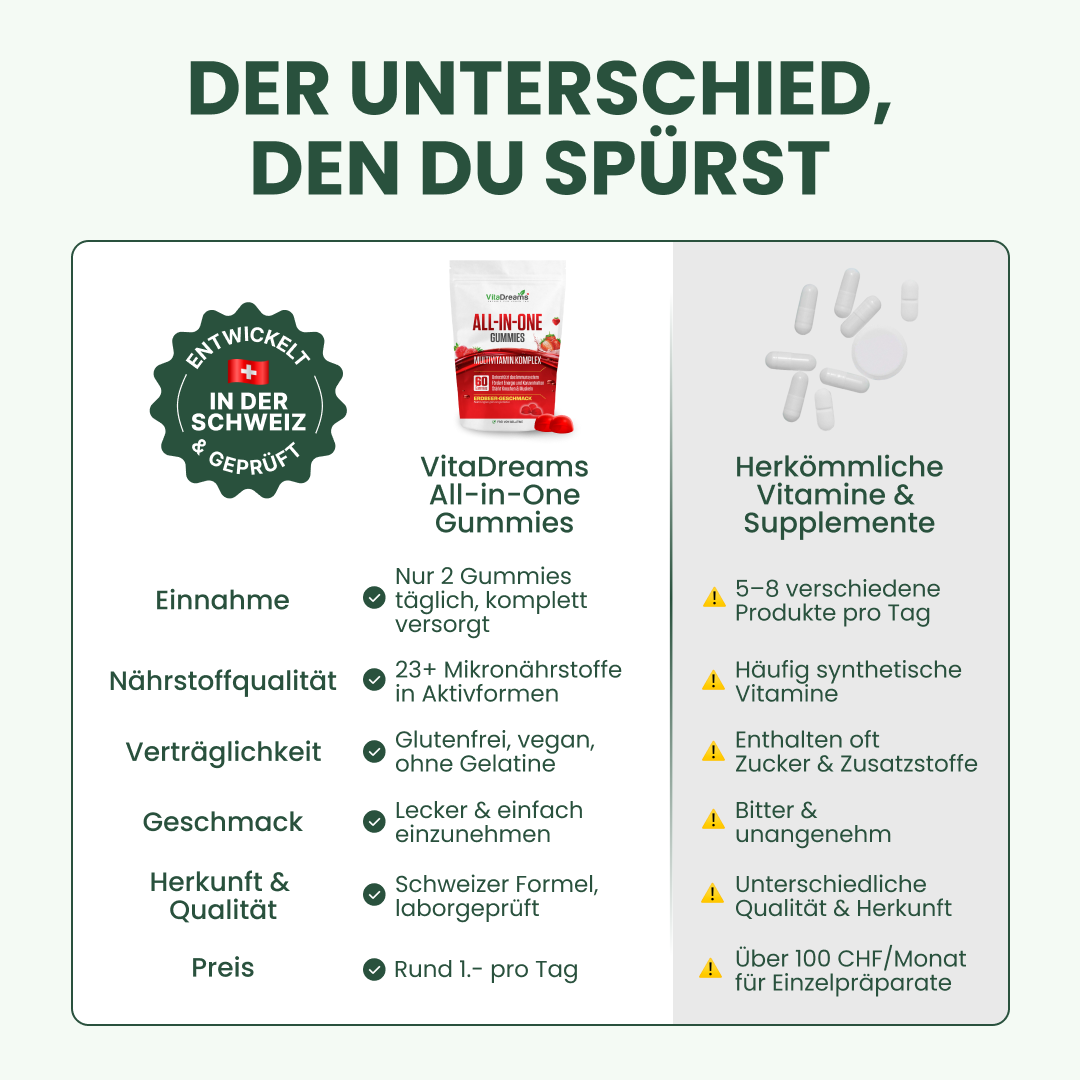Die VitaDreams All-in-One Gummies sind das smarte Schweizer Nahrungsergänzungsmittel für alle, die ihren Körper täglich umfassend versorgen möchten – einfach, lecker und ohne Tablettenmarathon. Nur 2 Gummies pro Tag liefern über 23 essentielle Vitamine, Mineralstoffe und Antioxidantien in hoch bioverfügbaren Aktivformen – entwickelt und laborgeprüft in der Schweiz.