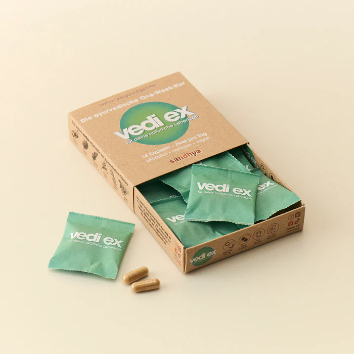 Das sandhya VEDI EX ist ein Nahrungsergänzungsmittel auf ayurvedischer Basis, das speziell als One-Week-Kur entwickelt wurde. Die sorgfältig abgestimmte Rezeptur aus sechs hochwertigen Pflanzenextrakten orientiert sich an jahrhundertealten ayurvedischen Traditionen und begleitet bewusste Phasen innerer Auszeit und Leichtigkeit im Alltag. Das Produkt wird von Expertinnen und Experten in der Schweiz entwickelt, in Deutschland nach HACCP-Standard abgefüllt und verkapselt sowie im Labor auf Pestizidfreiheit geprüft.